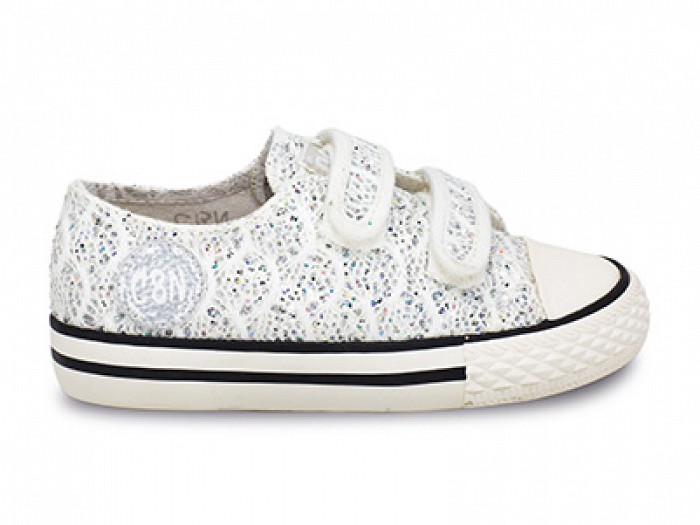 Fehér színű vászonból készült, flitterekkel és kövekkel díszített. Két tépőzáras fazonú lány tornacipő.