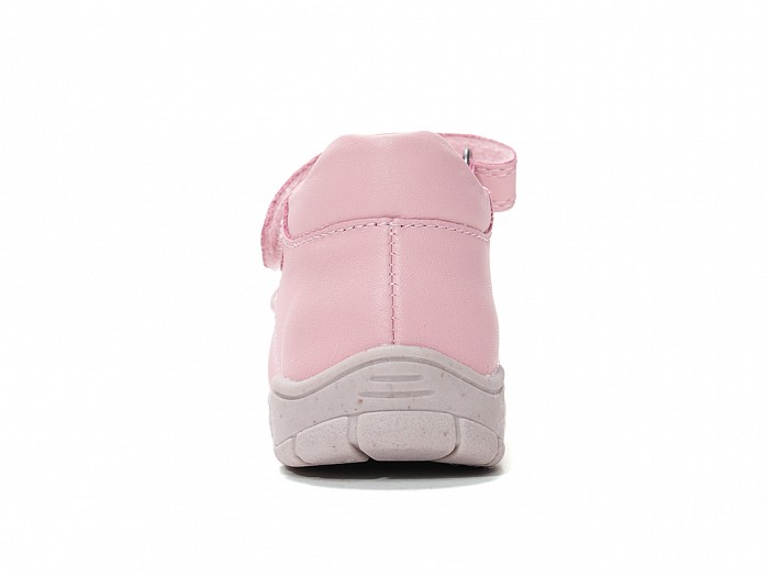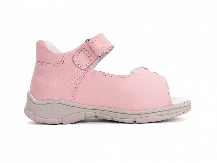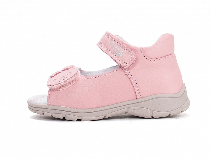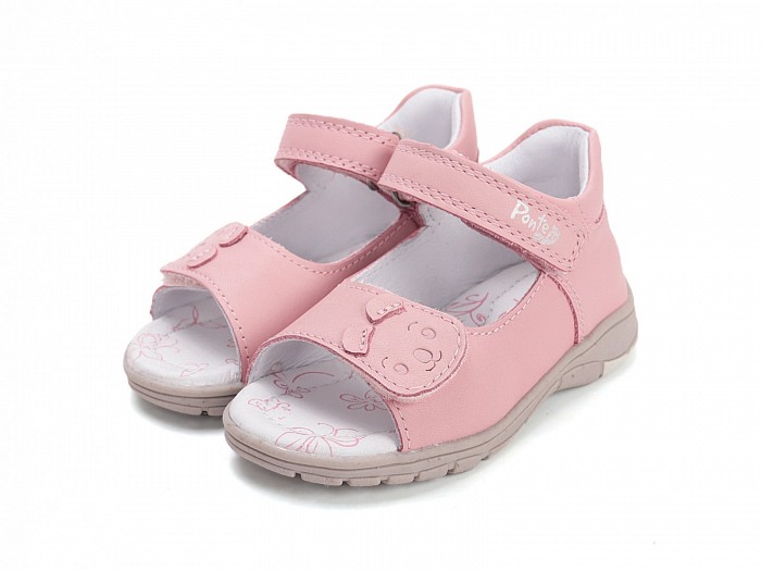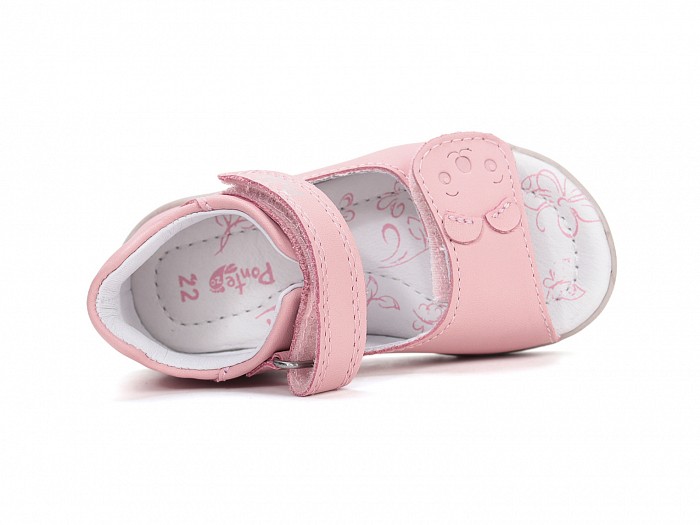 Rózsaszínű bőrből készült, alsó tépőzár részén állatfejes mintával díszített, supinált lány szandál.