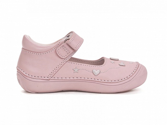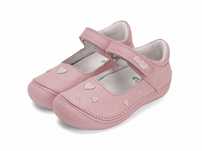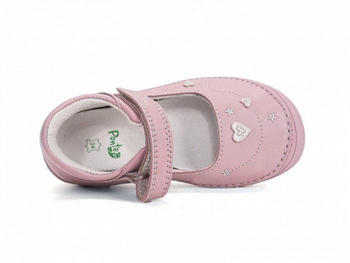 Rózsaszínű bőrből készült, orrvédelemmel ellátott, tépőzáras lány balerina cipő, szivecskés díszítéssel.