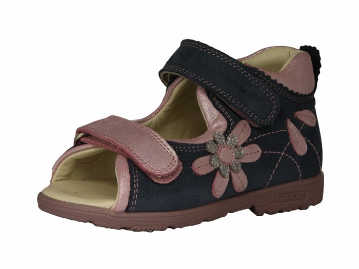 Sötétlila színű bőrből készült, tépőzáras supinált lány szandál, oldalán virág rátéttel díszítve. Ez a modell jól körül öleli és megtámasztja a vékony lábacskákat.