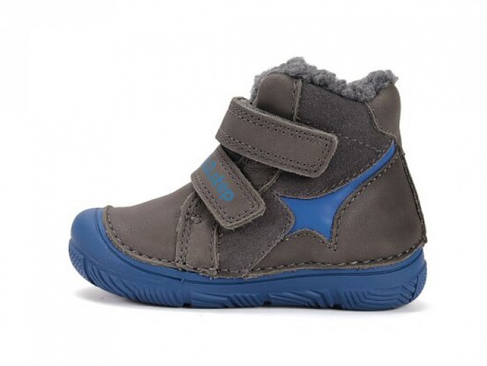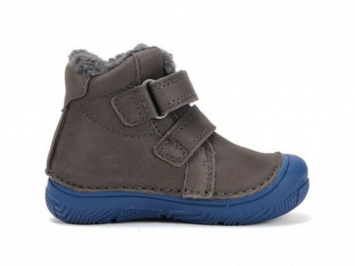 Szürke színű bőrből készült, tépőzáras, meleg bundabéléssel ellátott, fiú cipő, kék betét- és talprésszel díszítve. Sötétben az oldalán lévő minta fényvisszaverős.